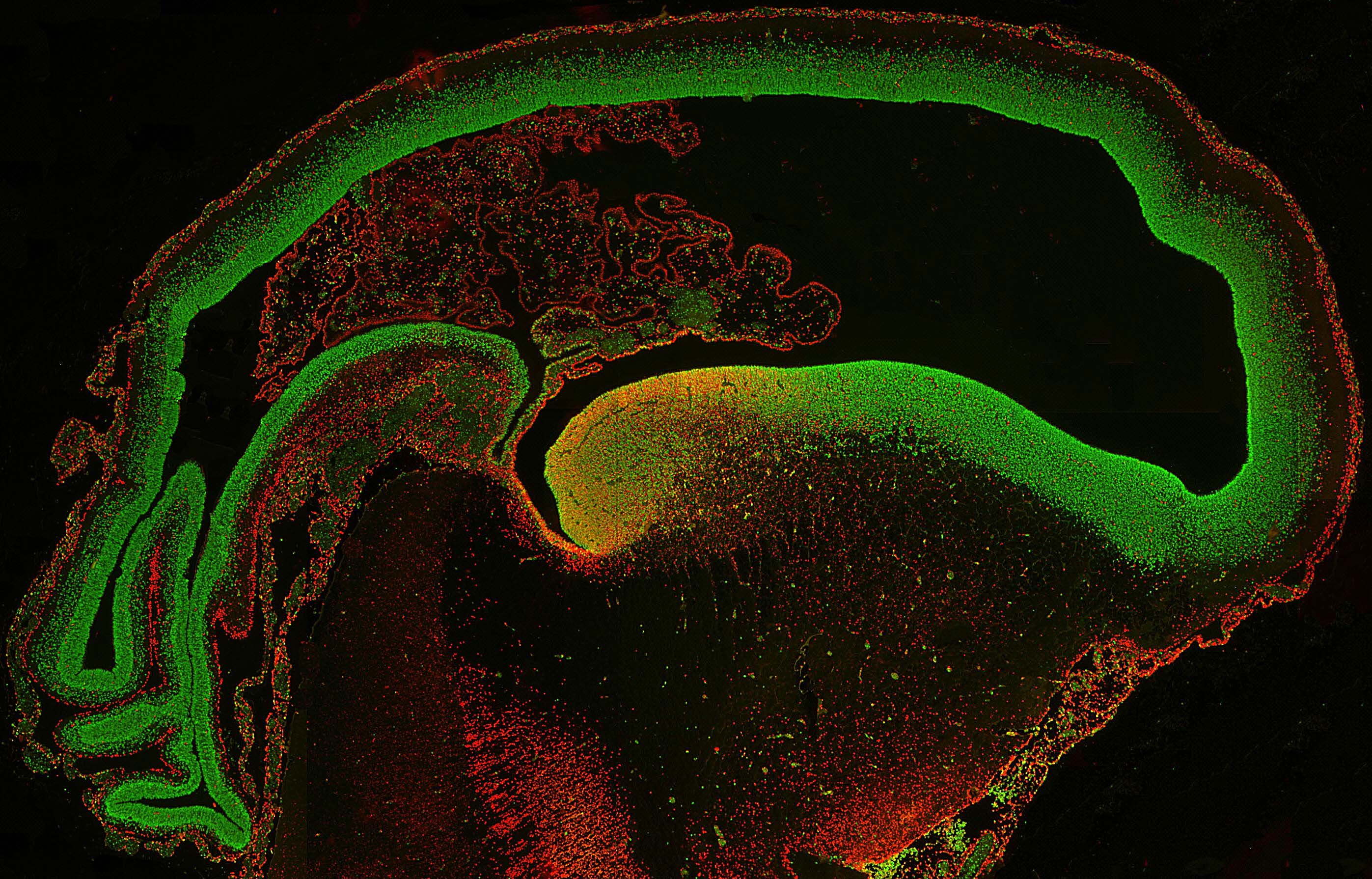 Description:Sagittal section of 8 post-conception week human early fetal brain (obtained fromwww.hdbr.org) stained by double label immunofluorescence for the cell division marker KI67 (green) andthe transcription factor COUPTFII (red). The combination highlights (yellow) regionalisation of COUPTFII-expressing dividing cells to the caudal ganglionic eminence. |