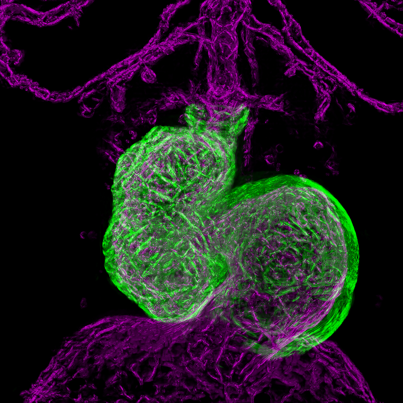 During tooth development the vasculature (Red) surrounds the forming tooth and starts to invade the dental papilla in response to Wnt signalling (Green). Image shows a confocal 3D Z-stack of a murine embryonic tooth germ (E14.5). Lef1-positive cells (Green) and CD31-positive endothelial cells (Red) shown by immunofluorescence. Nuclei DAPI (Blue) |