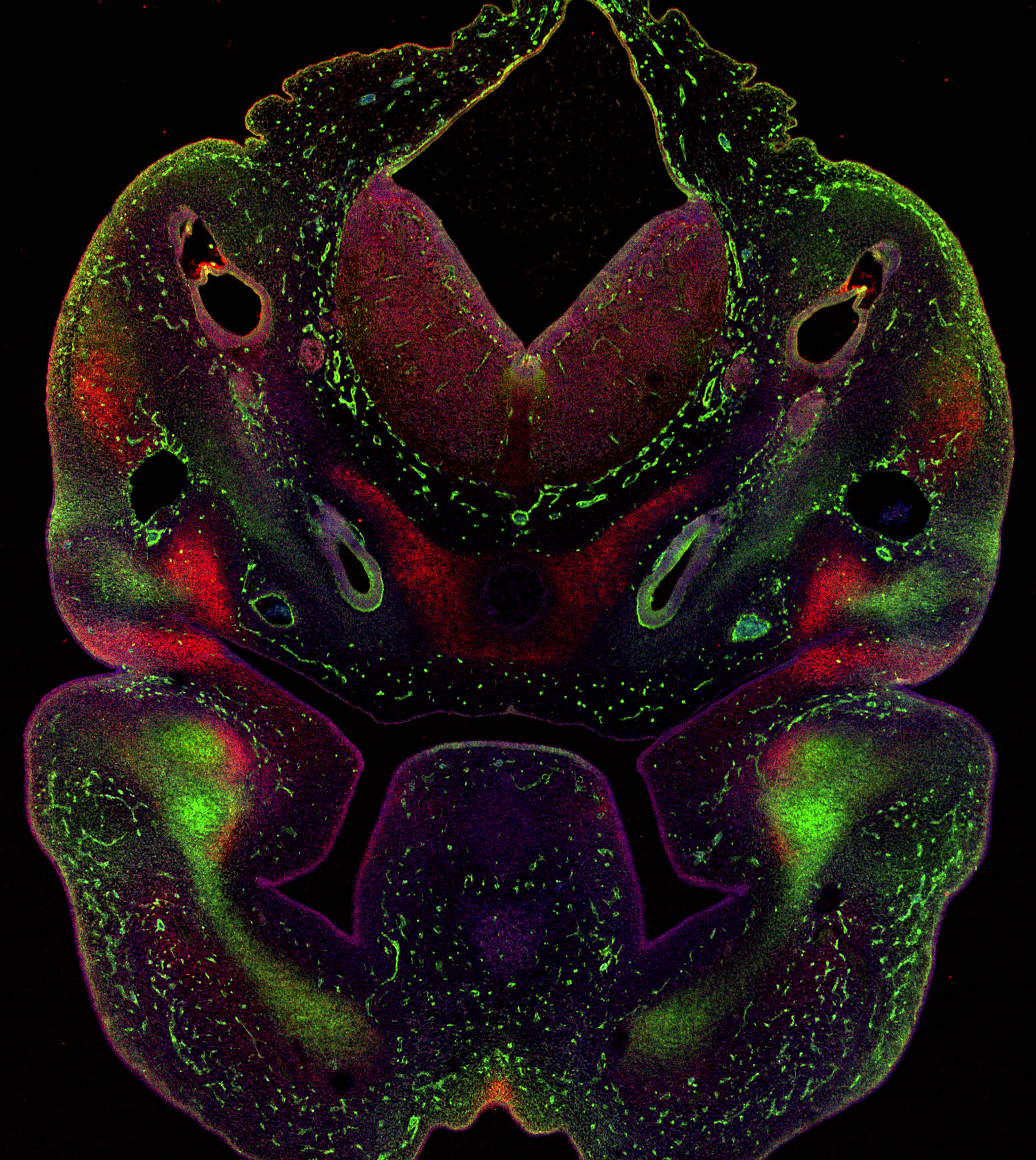 Description: A frontal section of an embryonic day 6 chicken head, showing the inner and middle ear, 2nd pharyngeal arches and tongue. Peanut Agglutinin Lectin (red), Sambucus nigra (green) and Wheat Germ Agglutinin (purple) fluorescently label neural tube, cartilage matrix, endothelial cells and epithelia. Lectin staining differentiates between cartilage elements.