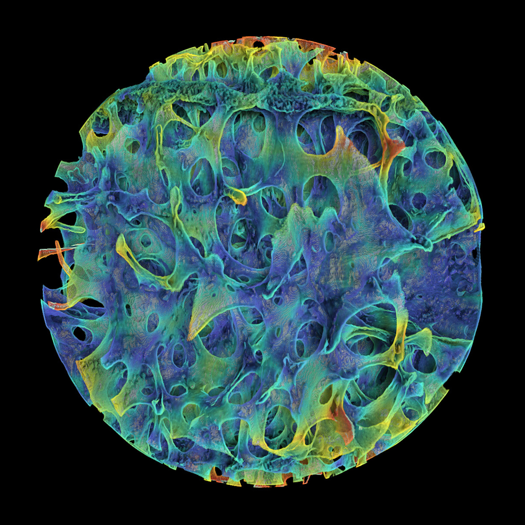 Description: A sphere digitally cut from a 2.5-year old human L1 vertebral centrum and coloured to highlight variation in trabecular thickness. It was created from microCT data using VGStudio and Drishti, for an ongoing project comparing the ontogeny of vertebral trabeculae in modern humans and Neanderthals.