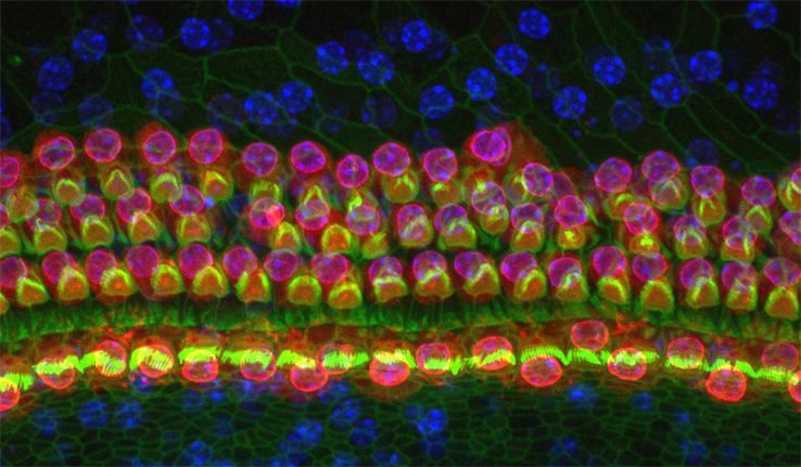 Description: SEM of a mouse middle ear mucosa. The mucosa is covered in a lawn of ciliated cells that help to clear the middle ear cavity. Red blood cells pseudocoloured in red.