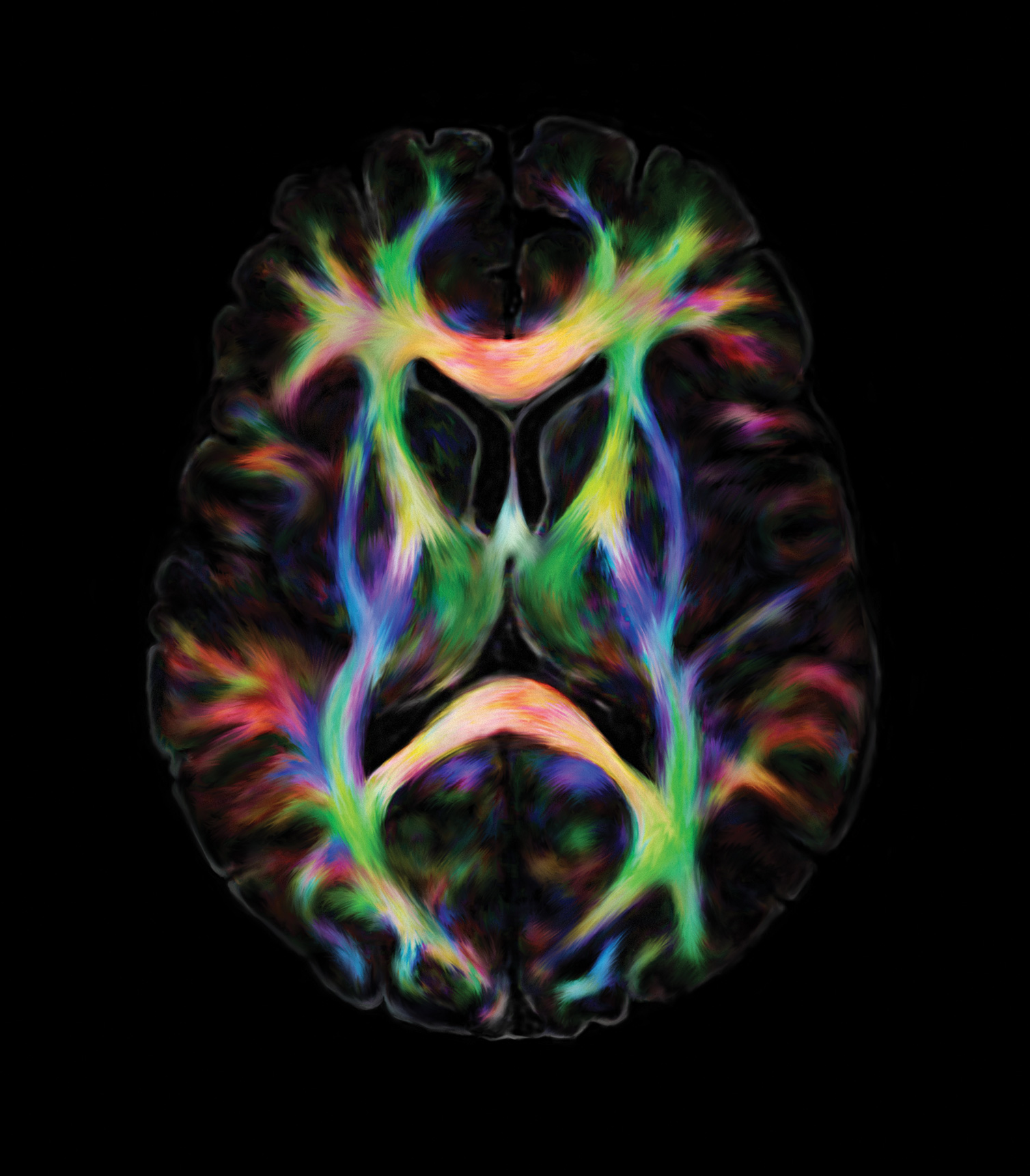 Description: Axial diffusion-weighted MRI tractography image of living human brain. Nerve fibre colour represents movement of water. Lateral diffusivity: red/orange; anterior-posterior: green; inferior-superior: blue. Acquired on Discovery MR750w 3.0T by GE Healthcare. Enhanced by Ben Crossman. Image to be used as cover of 5th edition of Neuroanatomy (Crossman and Neary; Elsevier).