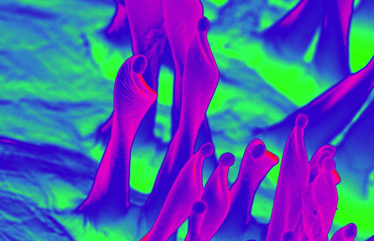 Description: This pseudo-coloured SEM micrograph shows sensillae located on the in the inner curvature of the forcipular apparatus of the House Centipede - Scutigera coleoptrata. The forciples have evolved from walking legs into pincer-like structures containing a complex venom gland and duct system; the sensillae aid in prey detection and capture.