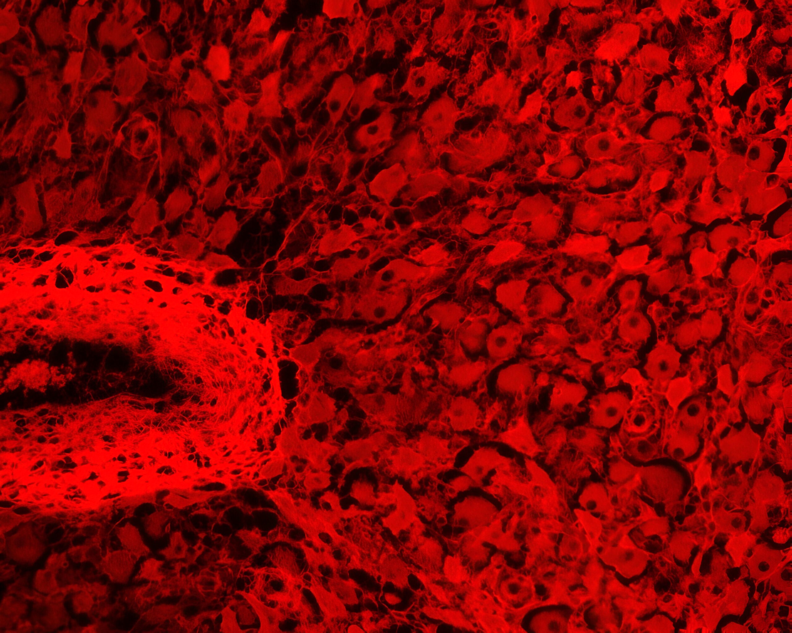 Corpus luteum of pregnancy showing Small and Large Luteal Cells encapsulated (dark red outline) by collagen fibers; located adjacent to network of capillaries (for progesterone release), a bigger blood vessel (RBCs in lumen) surrounded by dense collagen fibers visualized by Fluorescence Microscopy stained by PicroSirius Red (20X; Fluorescent Collagen Stain). |
