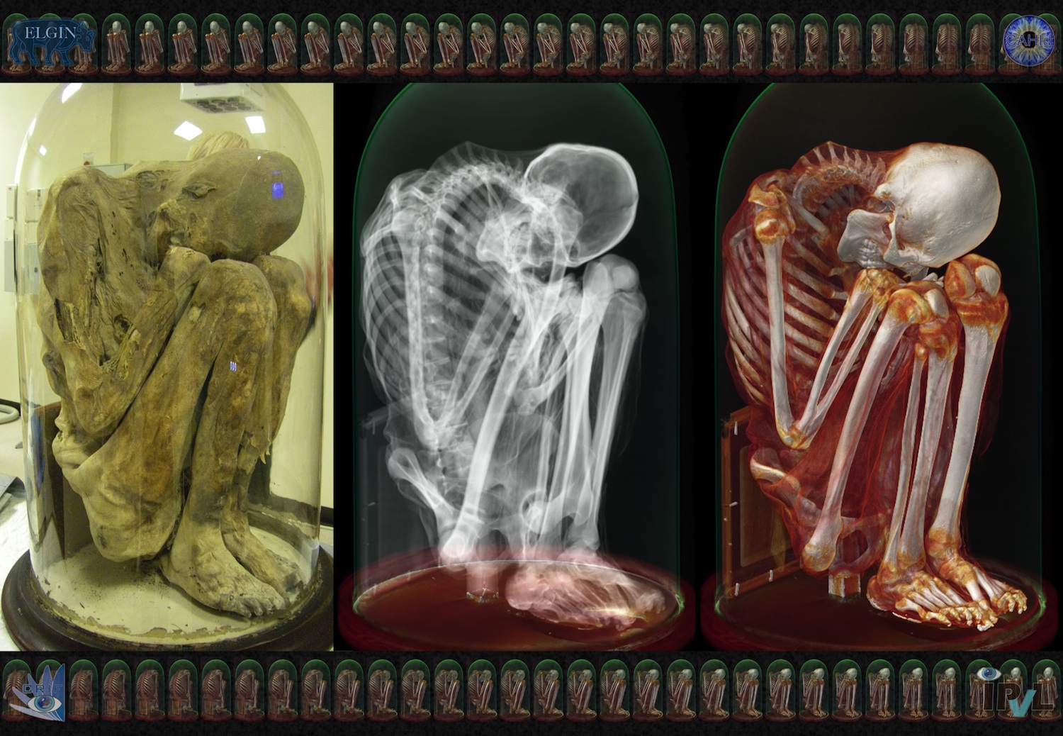 Description: A 15th century Peruvian mummy in a sealed glass-bell underwent forensic "phenotyping". Central to this study, a set of CT