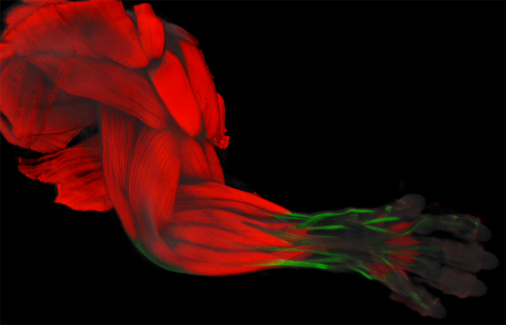 3D anatomy of an embryonic day (E) 16.5 mouse forelimb produced by optical projection tomography (OPT). The merged image shows muscle (red) stained with an antibody against muscle myosin (My32). Tendons (green) are labelled using a ScxGFP reporter. Autofluorescence (grey) provides an outline of all limb structures. |