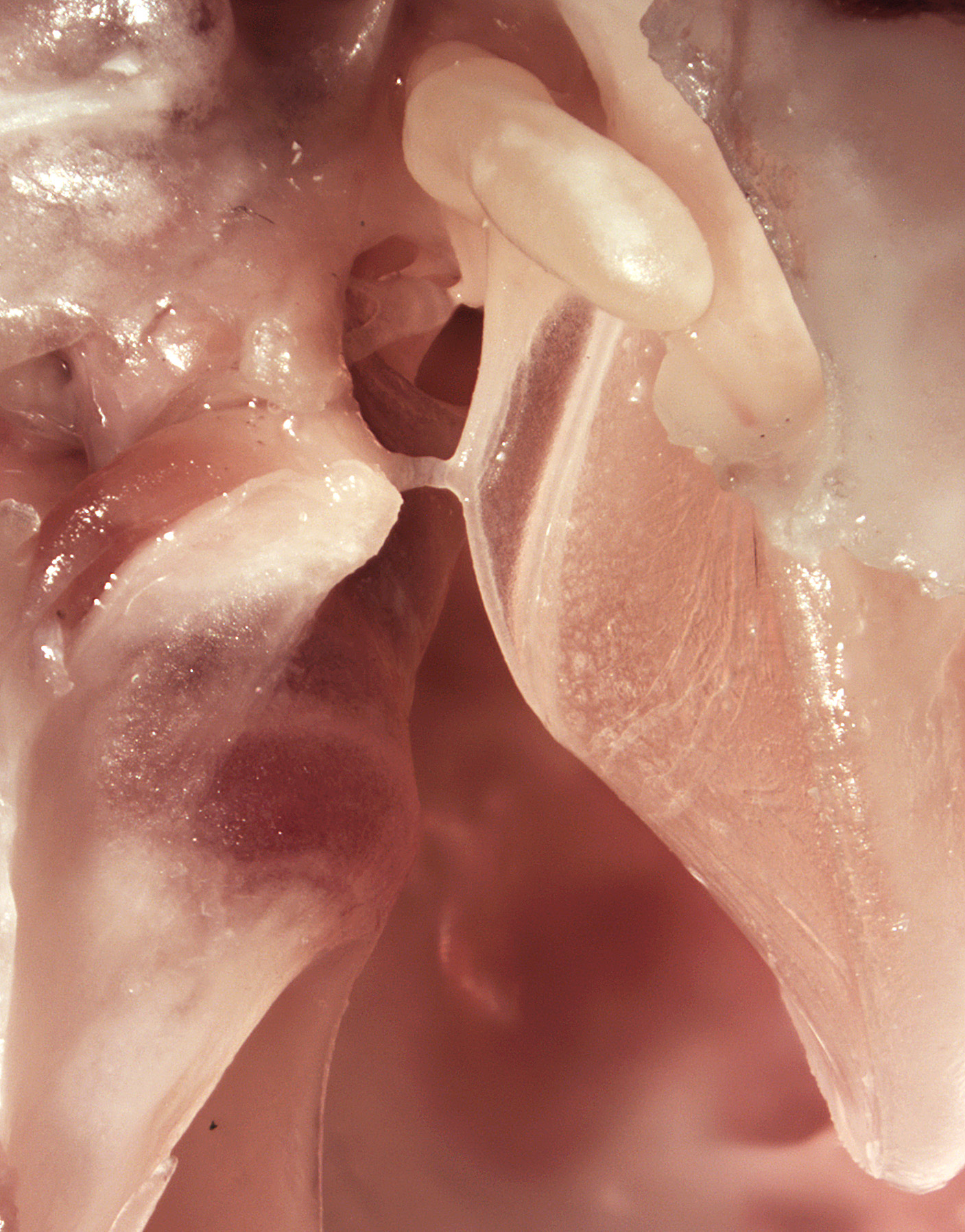 This is an Old World fruit bat embryo collected in 1972 at Ife University, Nigeria. The specimen has recently been processed for histological sectioning to investigate the process of tooth replacement, showing an example of archival tissue being used in modern day science. Image obtained with a Leica MZFLIII stereoscope. |