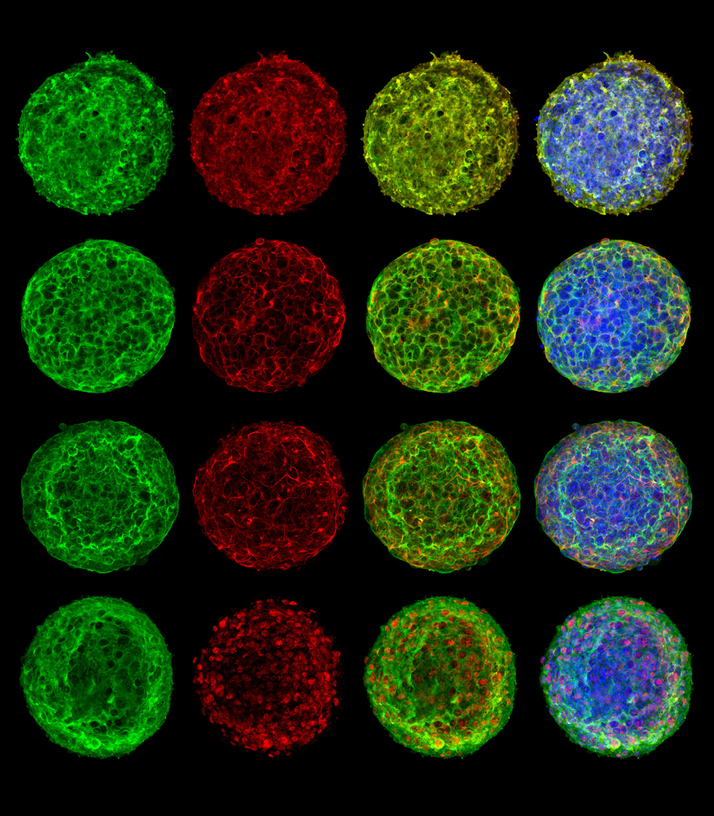 Description: Enteric neurospheres, generated from Wnt-1Cre;R26YFP mouse gut. Wnt-1 positive neural crest cells express YFP (green). The neurospheres are stained with dapi (blue) and immunolabelled with (from top to bottom in red) p75, TuJ1, GFAP, and Sox10. These immunomarkers confirm that gut neurospheres contain neural crest-derived cells, neurons, glia and ENS stem cells.