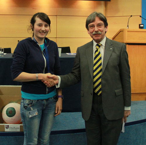 Sarah Roche, PhD student at the University of Edinburgh, supervised by Professor Tom Gillingwater accepts her Cave Young Investigator Award (Best Student Poster) from President D. Ceri Davies for her poster titled: Loss of glial neurofascin 155 delays developmental synapse elimination in the mouse peripheral nervous system.