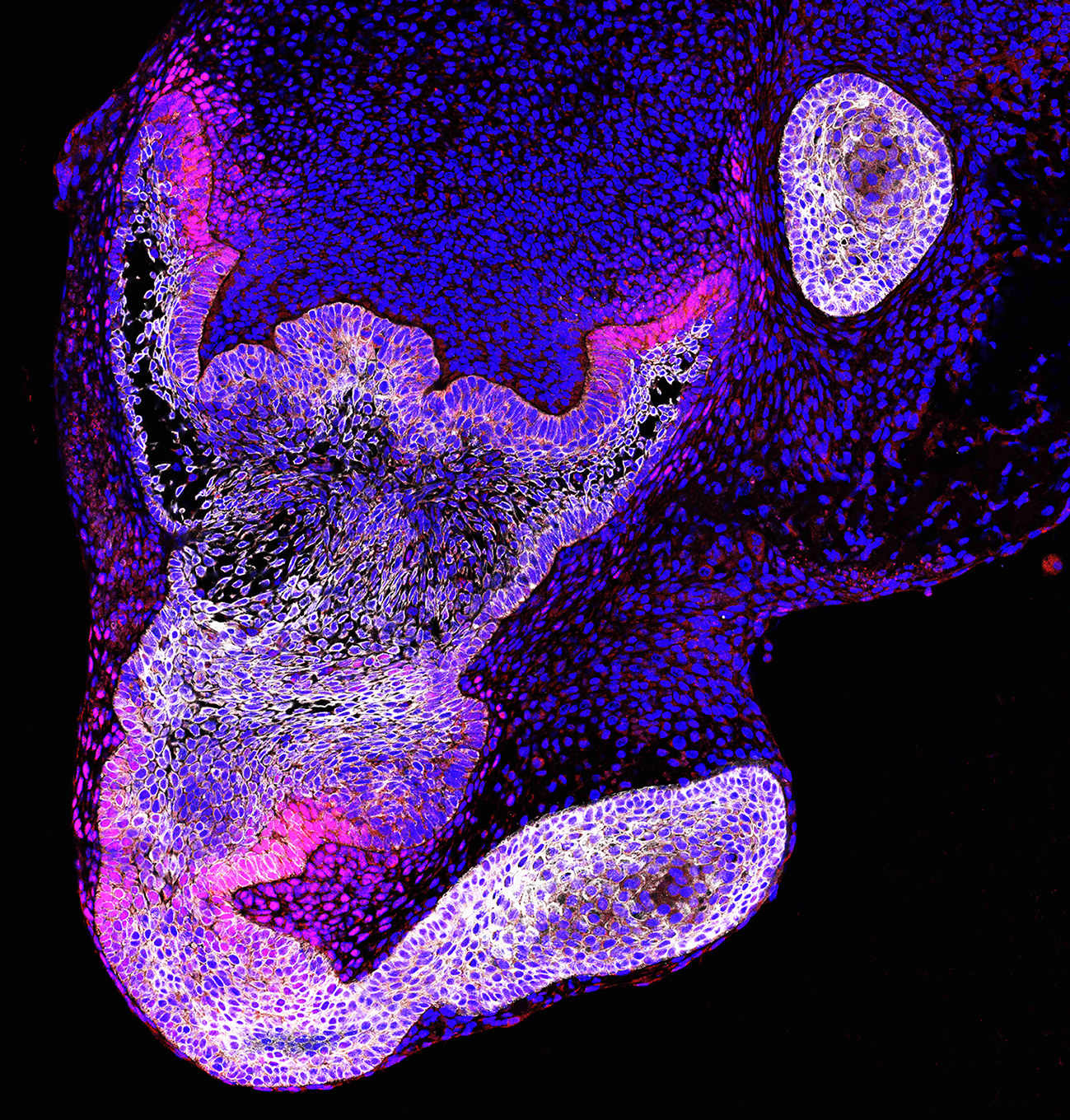 Immunofluorescence of an explanted embryonic mouse molar treated with an inhibitor to Hedgehog signalling ex vivo. Dampening hedgehog signalling leads to ectopic tooth formation from the dental epithelium (Keratin14 in white) as shown by elevated Wnt signalling (Lef1 in red), highlighting the signals that control tooth number. Nuclei in blue. |