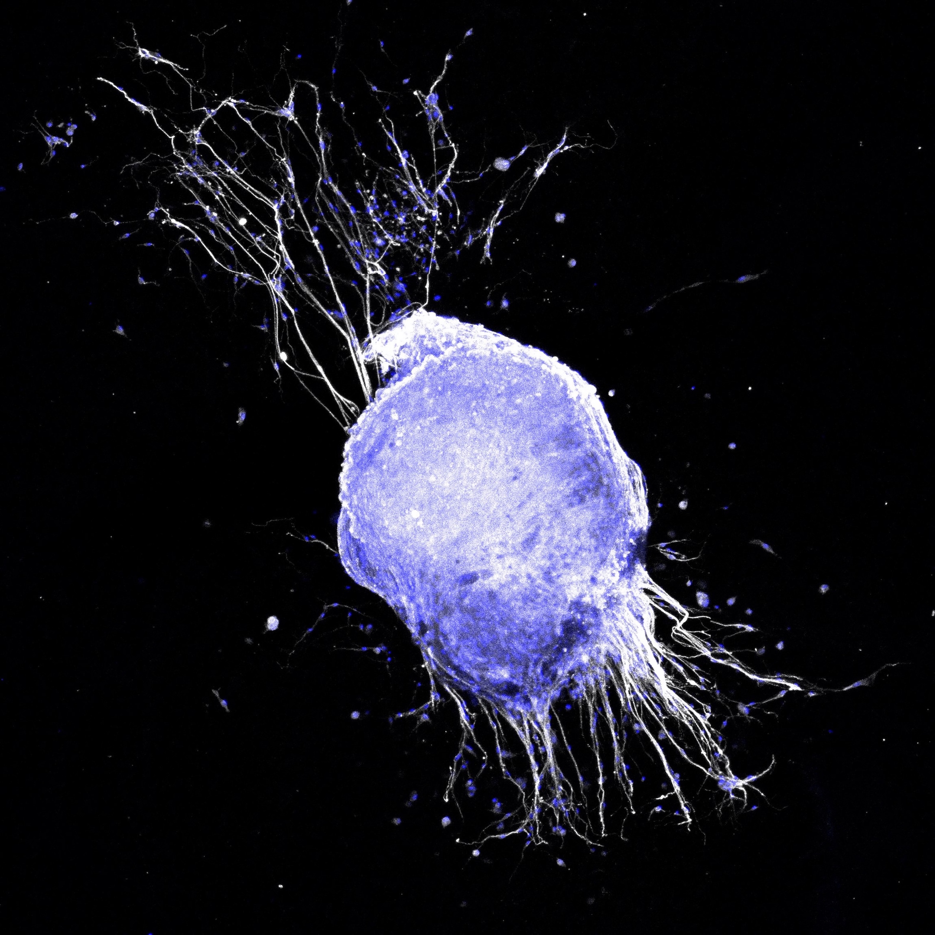 Dorsal root ganglion (DRG) neurons extend processes across a microRNA-activated scaffold, showing guided neural outgrowth necessary for the repair of chronic wounds. The image captures the early stages of connection formation on the bio engineered microenvironment. The confocal image displays cell nuclei in blue and beta-tubulin III in white. |