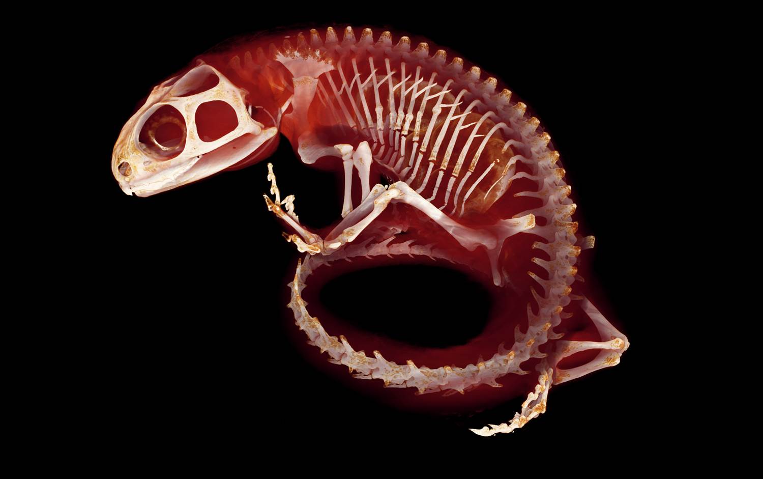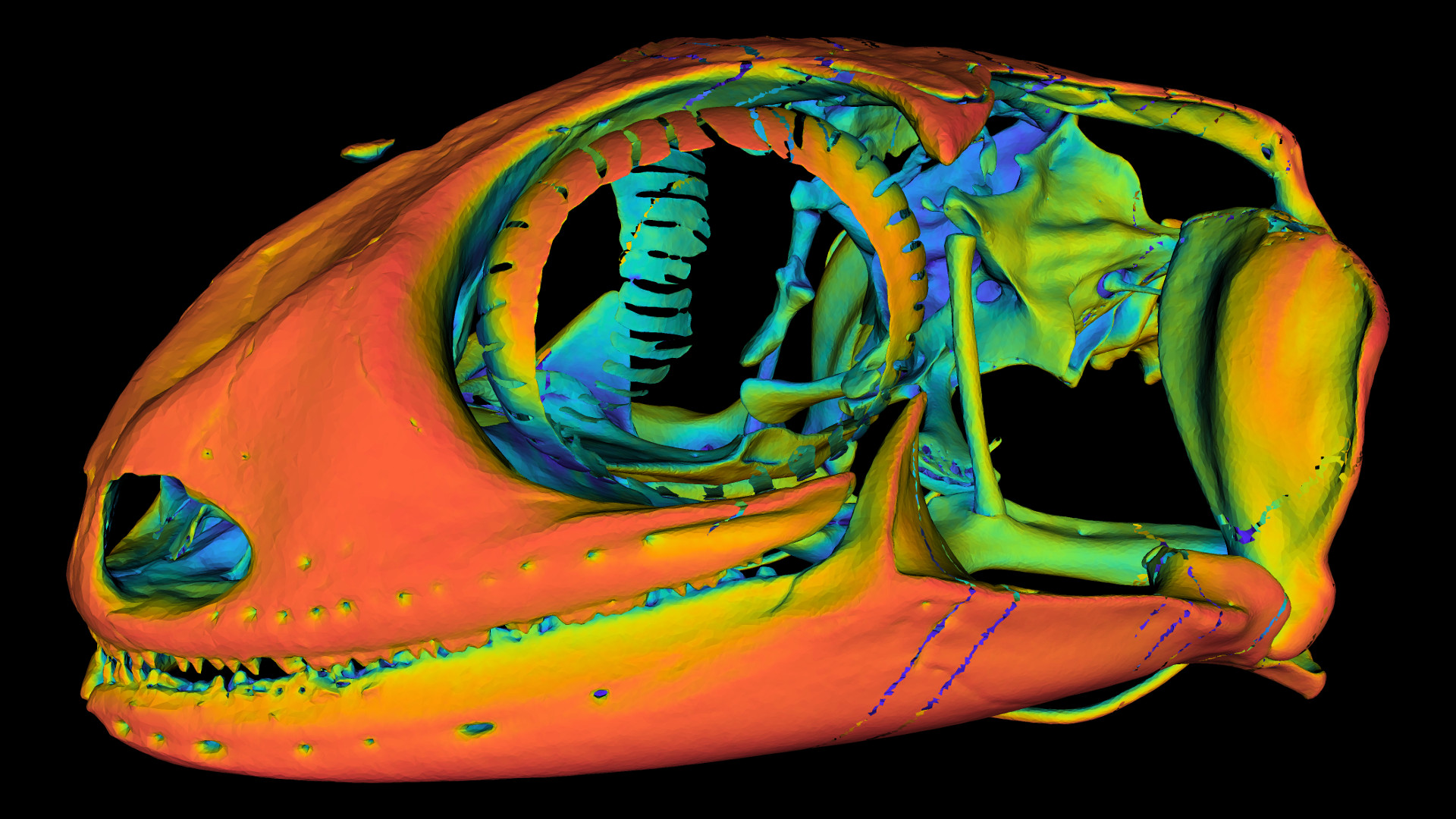 Description: 3D rendering of a gecko skull (Nephrurus levis) from micro-computed tomography (21 um/voxel). Colour corresponds to ambient occlusion (i.e. red surfaces are most visible, blue surfaces least visible). Steep colour gradients highlight foramina. Hidden structures (e.g. bony labyrinth, nasal cavity) can be extracted automatically based on their high occlusion.