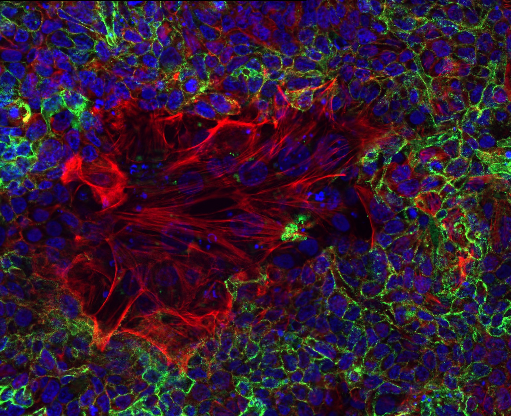 Description: Fluorescent image of an advanced in vitro mouse embryo attachment site exhibiting embryo outgrowth into human endometrial Ishikawa cells to detect OPN receptor, CD44, in green.Endometrial CD44 plays a role in embryo attachment and its localisation remains unchanged at embryo invasion site.Blue: Cell nuclei staining. Red: Actin cytoskeleton.