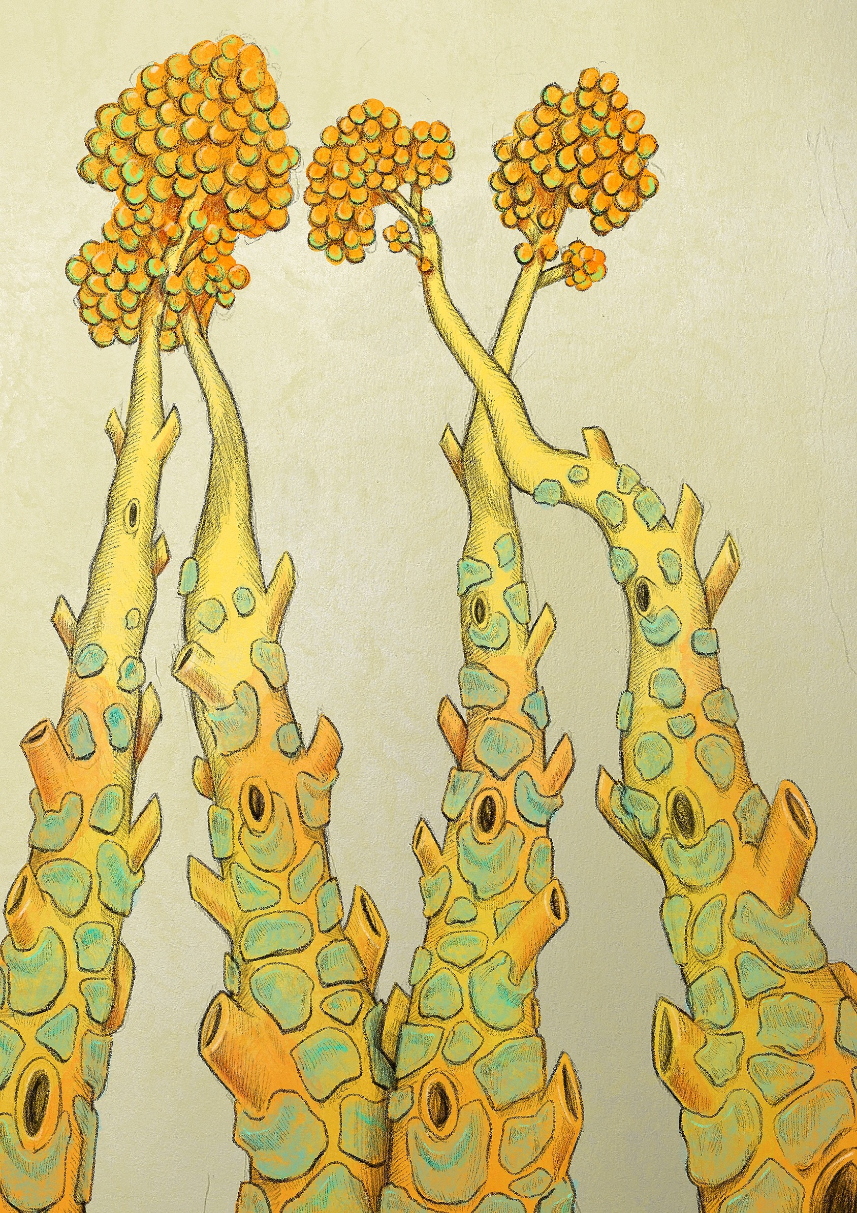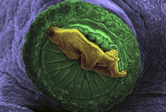 Description: A sucker of Octopus vulgaris analysed by scanning electron microscopy (SEM) was captured shedding its skin. A Cambridge Stereoscan360 (Image Access, V.3) was used for acquisition; Adobe Photoshop for pseudocolouring (sucker, green; shedding skin, yellow). This micrograph of the normal shedding process reveals the sophisticated nature of the octopus skin’s interdigitations (comparable to rete ridges in human epidermis).