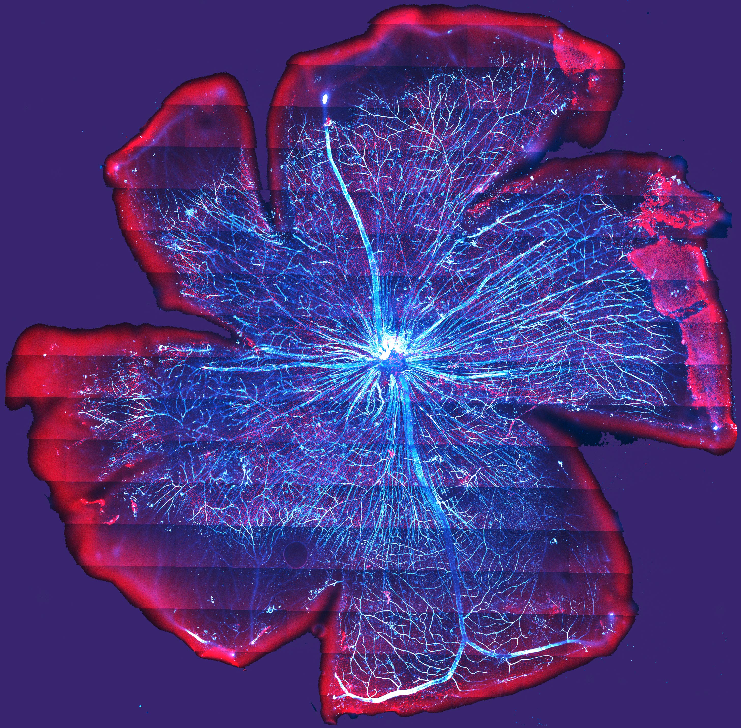 Neonatal mouse retinal ganglion cells undergo programmed cell death. Apoptotic cells on the edge of the growing vasculature can be labelled with specific markers such as Yo-PRO1 that fluoresce when binding to fragmenting DNA. Composition (arranged by blue-yellow, green-red colour opponency) inspired by Andy Warhol paintings. |