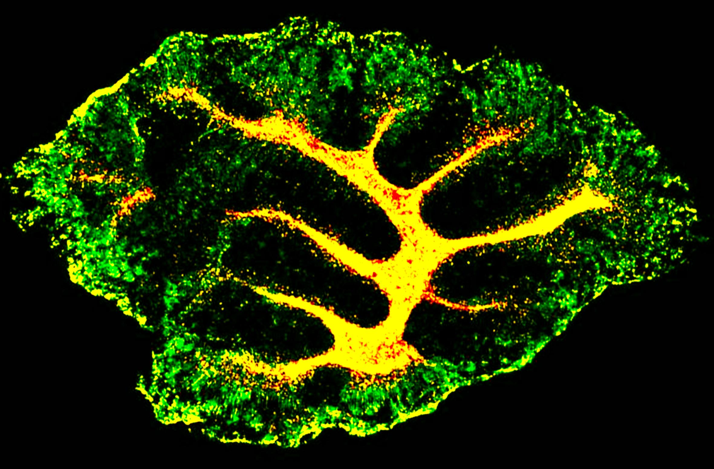 During tooth development the vasculature (Red) surrounds the forming tooth and starts to invade the dental papilla in response to Wnt signalling (Green). Image shows a confocal 3D Z-stack of a murine embryonic tooth germ (E14.5). Lef1-positive cells (Green) and CD31-positive endothelial cells (Red) shown by immunofluorescence. Nuclei DAPI (Blue) |