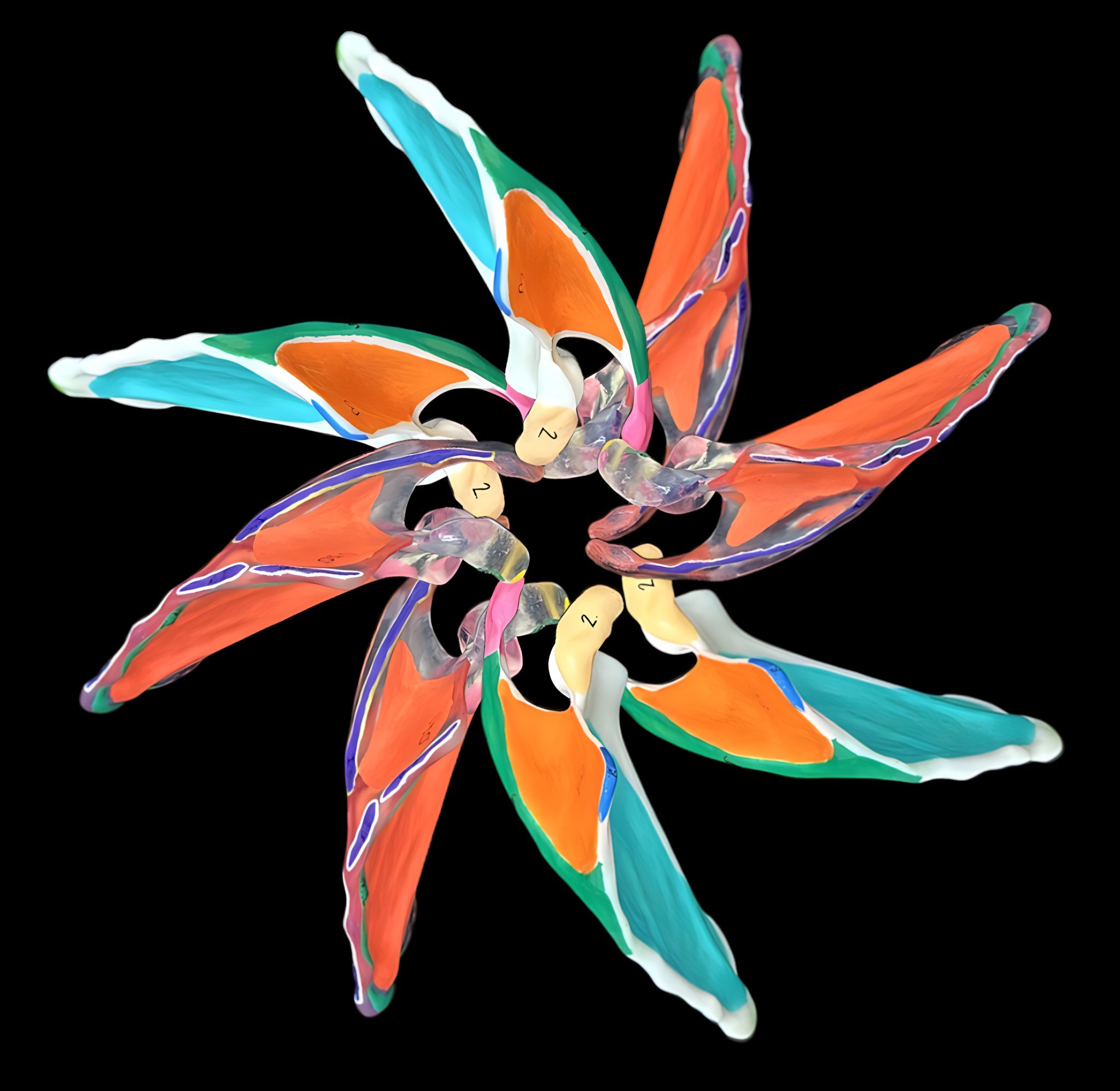 Scapulae were fabricated in white and clear resin from high-resolution scans to produce anatomically accurate models. These models were then hand-painted to highlight key skeletal landmarks and muscle origins and insertions to enhance their educational value. Two identical images of the models were overlayed to create the final floral patters. |