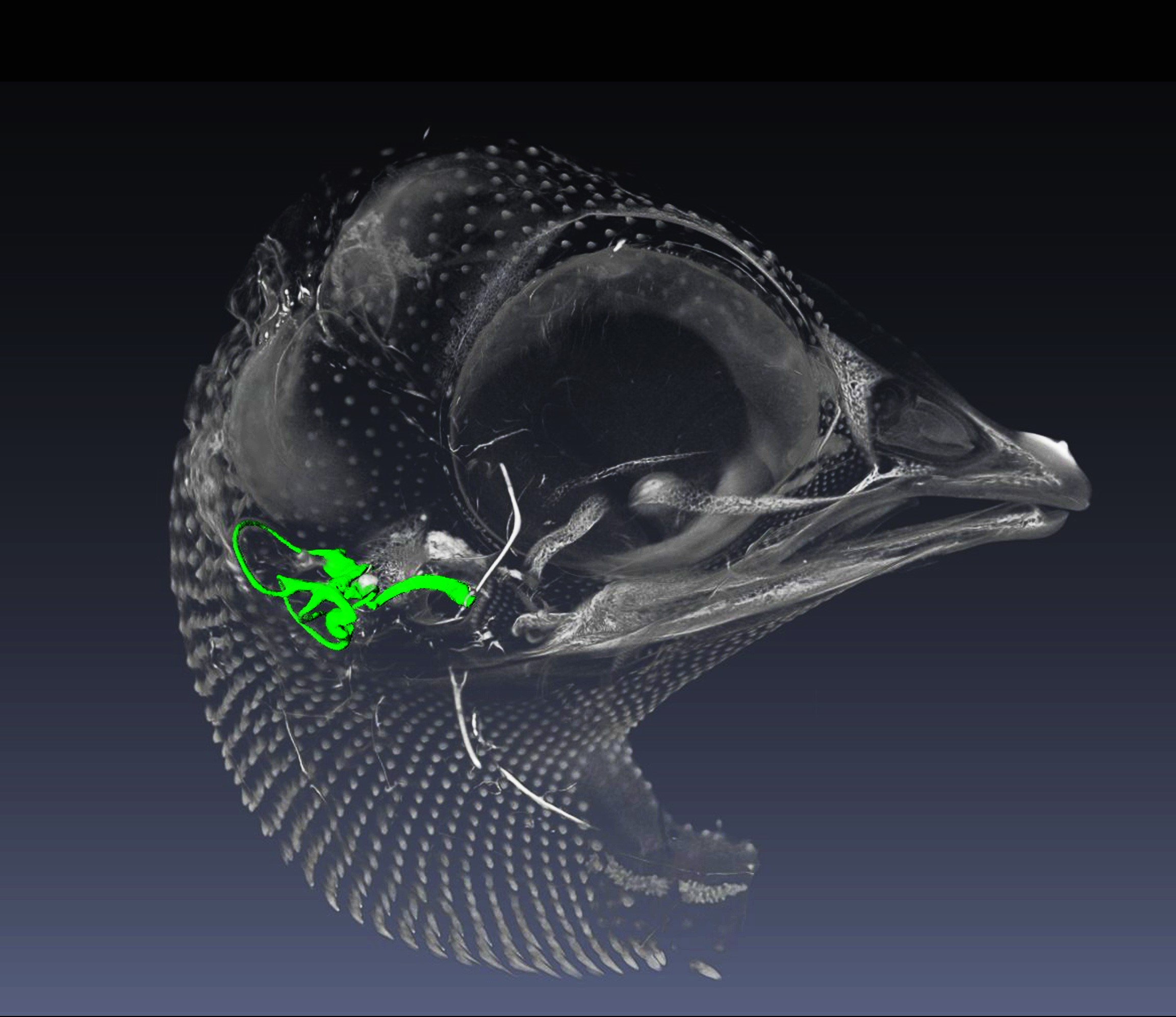 A micro-CT reconstructed image of a 10-day-old chick embryo with the inner ear structures. The semicircular canals, vestibule and cochlea are highlighted in green