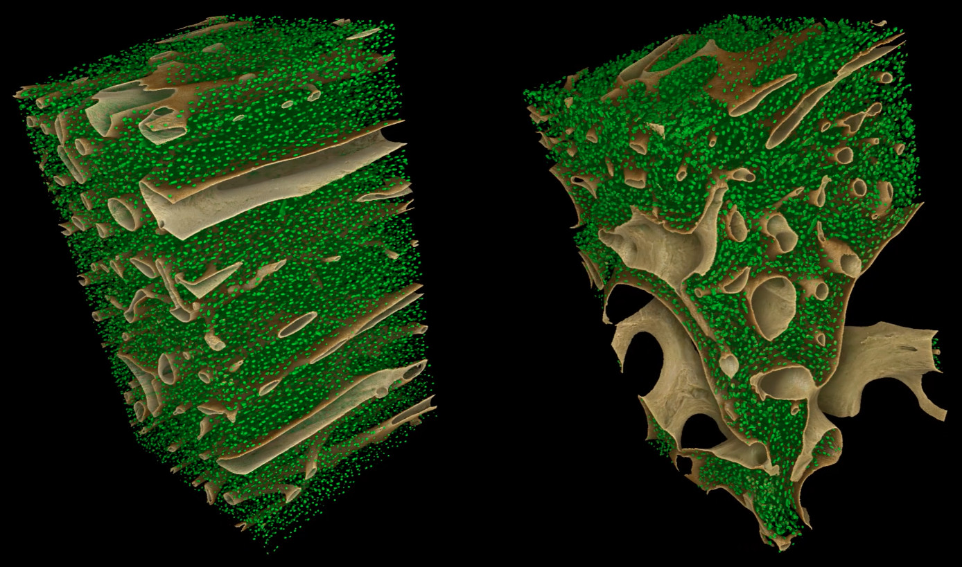 20-week-old male STR/Ort mouse knee, synchrotron scanned at Diamond Light Source (MG28353-1), in coronal plane. Pixels more than one standard deviation away from mean greyscale values have been highlighted in ImageJ, and false colours applied in photoshop tinting bone (blue), marrow (orange), cartilage (green) and calcified cartilage (purple). |
