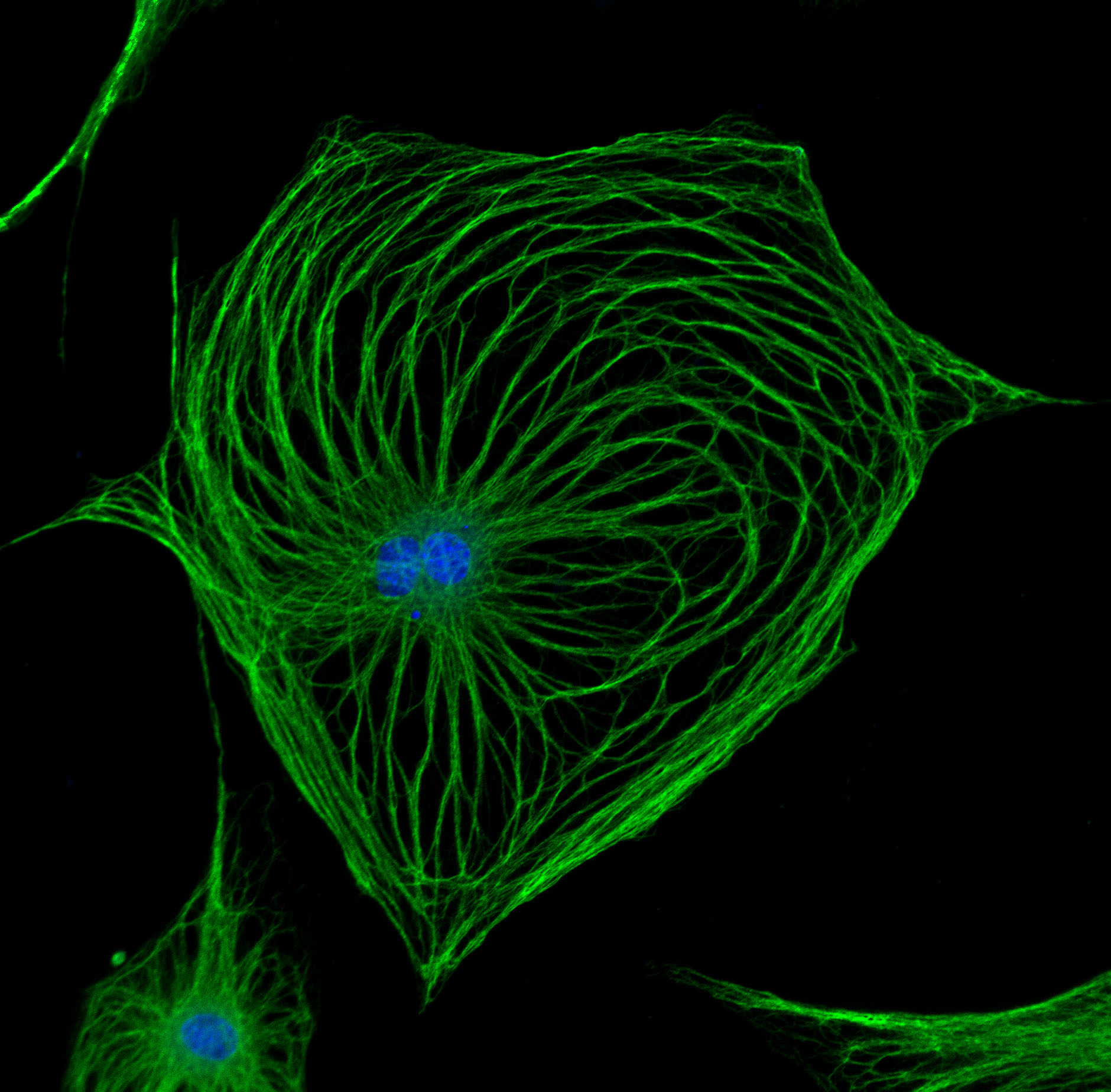 Description: Image shows the morphology of rodent spinal astrocytes, which play an important role in numerous functions in the central nervous system. Vimentin (green) demarcates the cytoskeletal structure, illustrating the extensive processes of these cells and dapi (blue) shows the nucleus. The image was captured using a Zeiss LSM710 Confocal microscope.