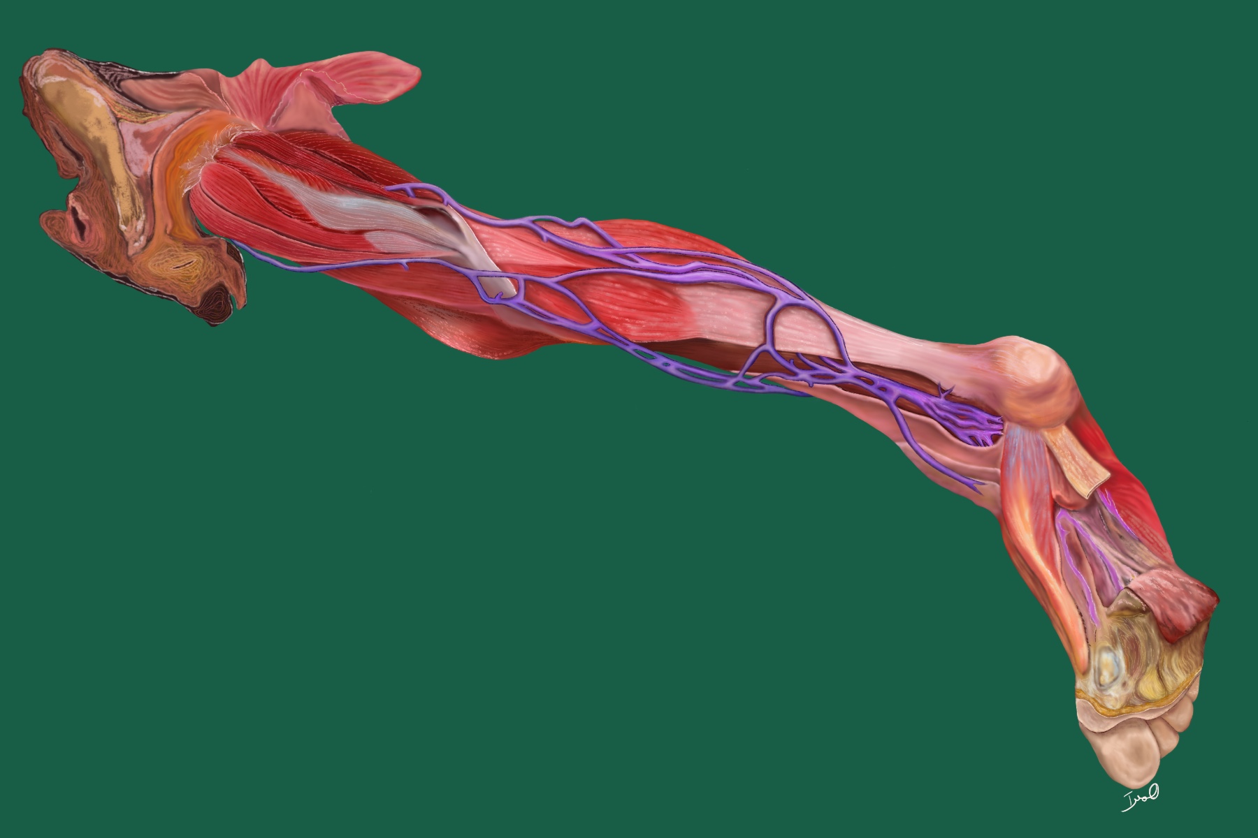 Digital painting of a preserved wet specimen prepared to demonstrate the superficial muscles and vessels of the lower limb. This specimen highlights anatomical clarity in muscle orientation and vascular pathways, enhancing educational understanding of lower limb anatomy through precise visual representation. |